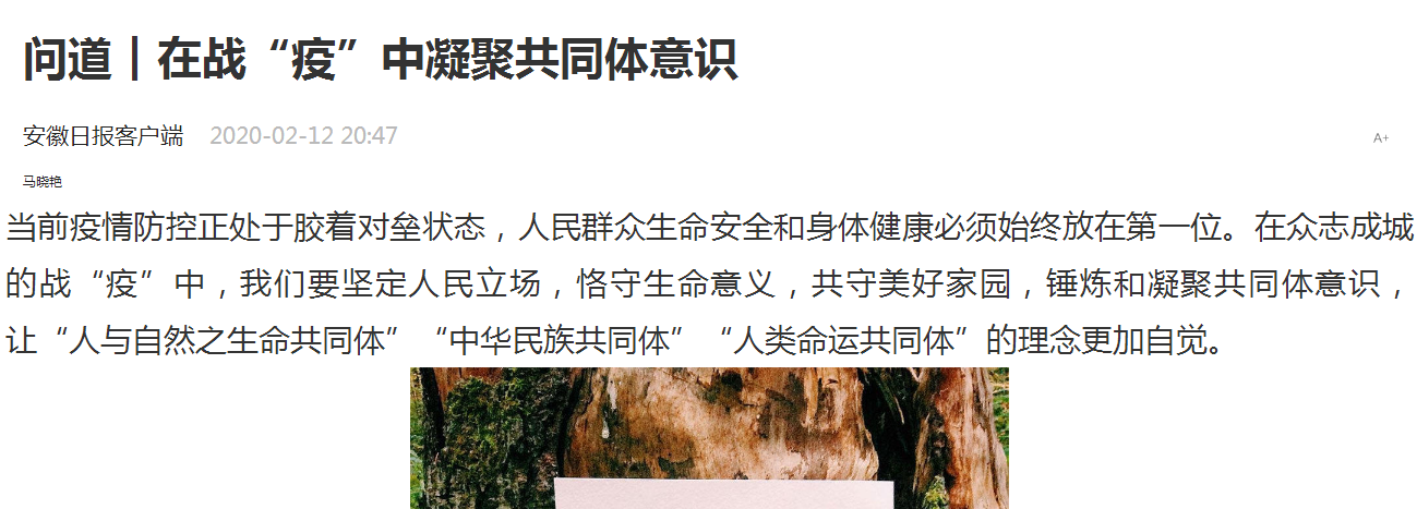 编者按:在当前抗击疫情关键阶段,我们要坚定人民立场,恪守生命意义,共守美好家园,锤炼和凝聚共同体意识,让“人与自然之生命共同体”“中华民族共同体”“人类命运共同体”的理念更加自觉。2月12日,安徽日报发表了必赢马克思主义学院教师马晓燕的文章《在战“疫”中凝聚共同体意识》,学习强国平台也进行了转载报道。