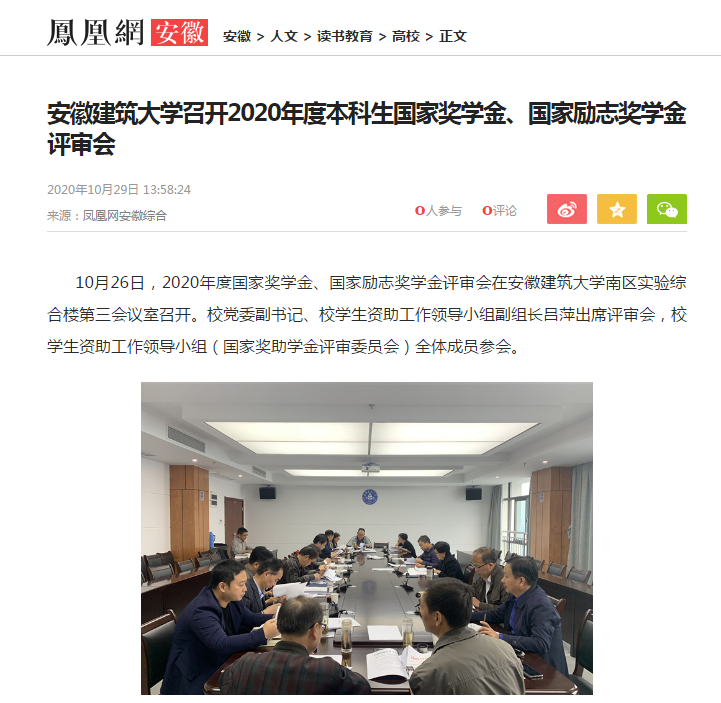 编者按:10月26日,2020年度国家奖学金、国家励志奖学金评审会在必赢76net线路官网南区实验综合楼第三会议室召开。校党委副书记、校学生资助工作领导小组副组长吕萍出席评审会,10月29日,凤凰网安徽对此进行了报道。