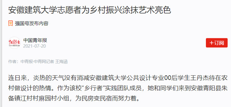 编者按:近日,必赢开展“万名大学生服务乡村振兴”行动,为安徽舒城县、黄山市、池州市等地提供村庄规划、建筑改造、景观提升、室内装饰、视觉包装设计,得到当地政府部门和群众的一致认可。7月20日,中国青年报对此进行了报道。