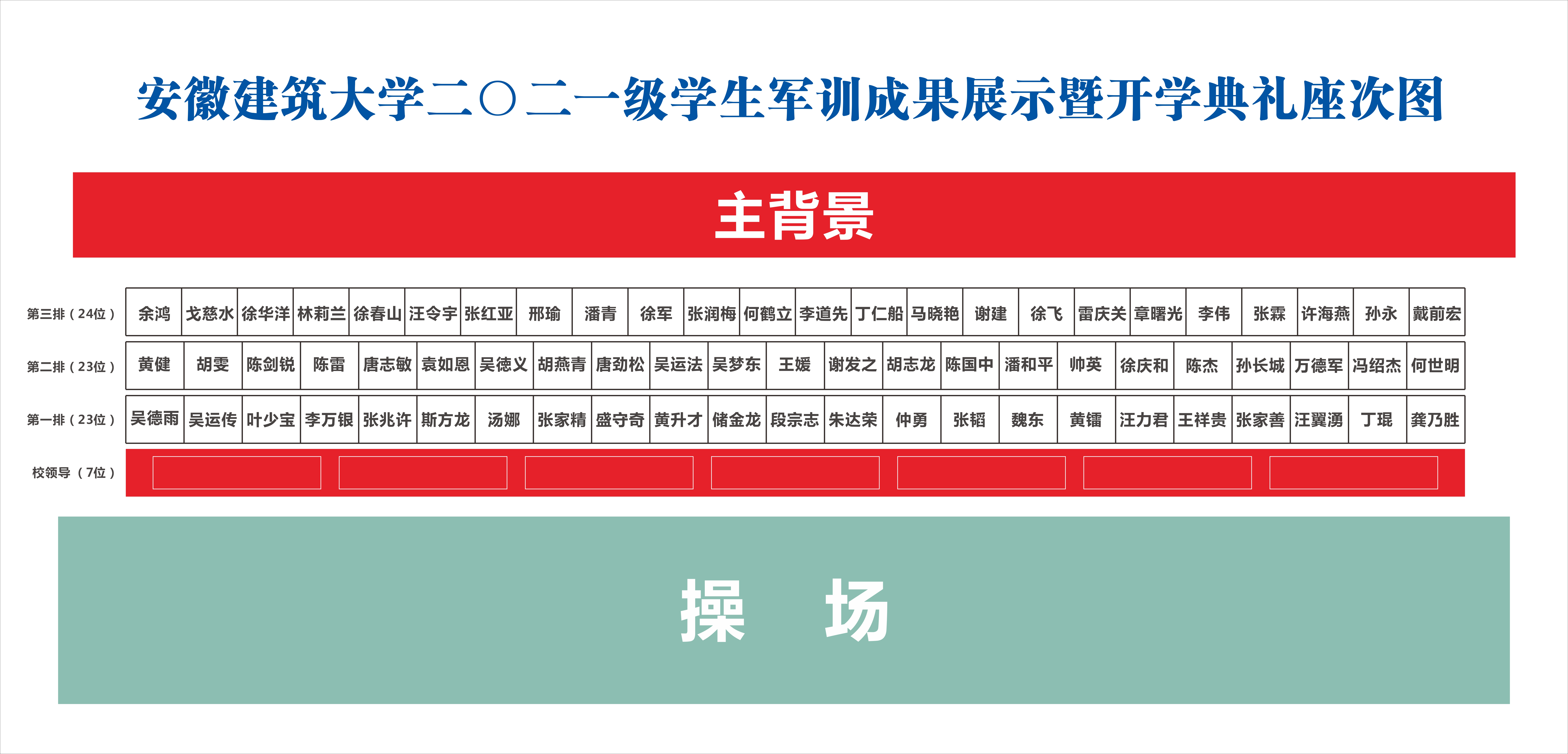 (三)请参会的各职能部门主要负责人、各学院党政负责人在主席台指定座位就座,主席台就座人员着正装(浅色衬衫,黑色裤子,黑色皮鞋),军训旅成员着军训服装;