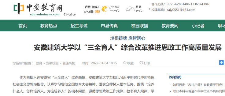 编者按:作为首批入选安徽省“三全育人”试点高校,必赢多措并举,统筹办学治校各领域、教育教学各环节、人才培养各方面的育人资源,不断深化“三全育人”综合改革,推进学校思想政治工作高质量发展。1月4日,中安在线对此进行了报道。