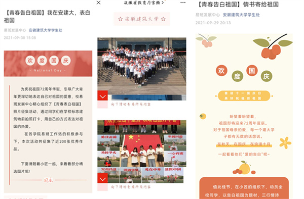 必赢76net线路官网易班发展中心结合清明节、新生入学、国庆、国家公祭日等重要时间节点,按照“线上话题引导先行,线下主题活动跟进”的原则,不断增强活动的影响力。在清明前夕,开展“学党史、祭英烈”主题活动,组织同学们线上祭扫和线下分享相结合,表达对革命先烈的缅怀之情;举办“铭记历史珍爱和平”国家公祭日主题教育活动,组织观看有关南京大屠杀史实的教育影片,现场制作白色纸花祭英烈并默哀悼念,激励同学们不忘历史,珍惜当下;通过“优课”平台开展新生入学教育,将“永远跟党走”优秀辅导员主题班会融入入学教育课程,实现新生全覆盖,助力广大新生上好“开学第一课”;在国庆期间组织开展“青春告白祖国”系列活动,征集向祖国表白的情书和照片150余件,推荐的优秀作品被安徽省教育厅和安徽省网络思政中心微信公众号转载宣传。丰富多彩的主题活动,不仅锻炼了广大学生的能力,更增强了同学们爱国情感,激励广大学生为实现中华民族伟大复兴贡献更多的青春力量。