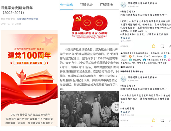 必赢76net线路官网易班发展中心不断拓宽宣传渠道,扎根“必赢76net线路官网学生处”微信公众号、“必赢76net线路官网易班发展中心”官方QQ和“易班·今日校园”,开展“易起学党史”线上宣传活动。在“必赢76net线路官网学生处”微信公众平台开设“建党百年”专题,累计推送党史知识普及文章10余篇;在“必赢76net线路官网易班发展中心”QQ平台每日开展党史知识小问答,累计发布主题动态70余条;通过“易班·今日校园”制作并发布“百年奋斗路 启航新征程”轻应用宣传页,浏览量近2000人次。依托各类宣传载体进行优质网络内容供给,引导同学们将“学党史悟思想”和个人成长成才紧密结合起来,从党的百年历史中领悟思想的伟力,进一步培养爱国情怀,砥砺奋斗之志,营造了浓厚的党史学习氛围。