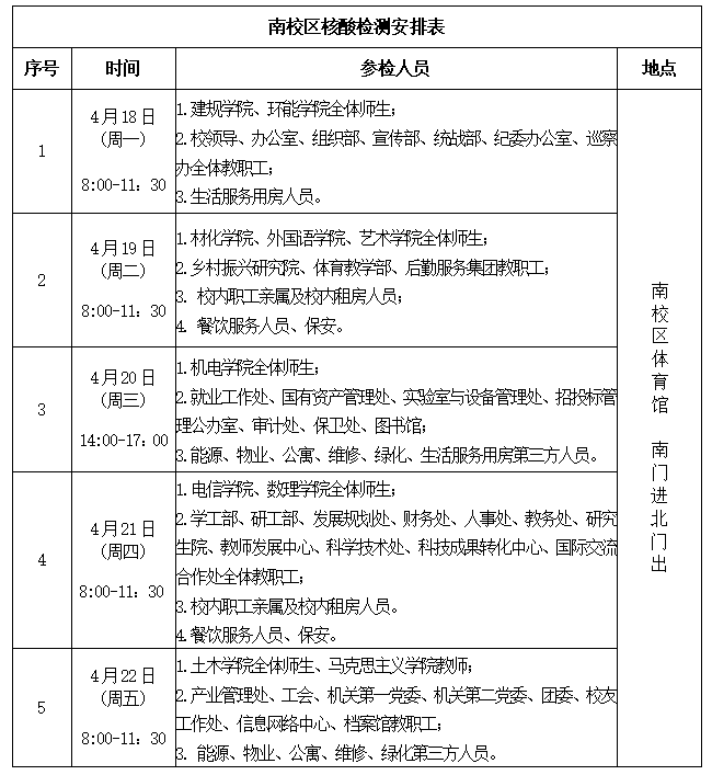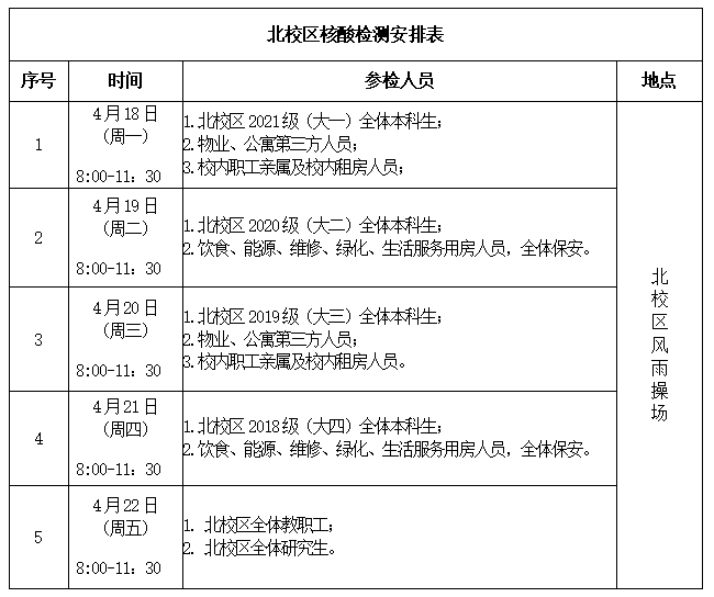 按上级疫情防控部门要求,4月18—22日,学校开展本学期第六轮全员核酸检测,做到一周全覆盖,其中教职工(除下表已安排到本单位的1次检测,另外1次根据核酸检测时间安排表自选,两次核酸检测时间间隔至少48小时)、住校内职工亲属及校内租房人员、第三方服务人员每周至少参加核酸检测2次,具体安排如下: