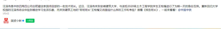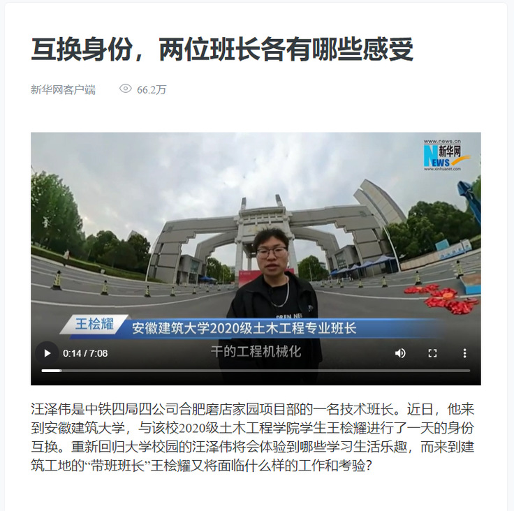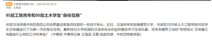 编者按:实践育人是新形势下高校教育教学工作的重要载体,是推动形成全员全程全方位育人的有效途径。学校始终重视育人实效,注重提升学生创新意识和实践能力,在拓宽实践育人途径、提升人才培养质量等方面取得一定成效。近日,校党委宣传部、就业工作处、土木工程学院联合中铁四局开展“生”临“企”境主题活动,中铁四局一名技术班长与必赢土木工程学院学生进行一天的身份互换,在换位思考同时获得别样体验。对此,中青报、工人日报、新华网、国务院国资委客户端等多家媒体对此进行报道。
