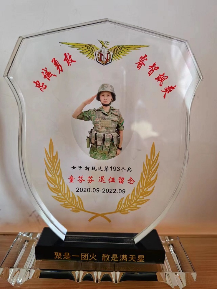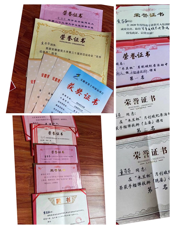 2022年9月,她光荣退役,带着军人铁一般的意志回到了学校。入学以后,她靠着自身努力再次快速适应学习环境,从“优秀士兵”变身为“优秀学子”。一份耕耘,一份收获,童芬芬在学校继续发扬部队不怕吃苦的优良传统和勤奋踏实的工作干劲,积极参加各项实践活动,顺利完成学业,并获得了校级“优秀毕业生”的光荣称号。