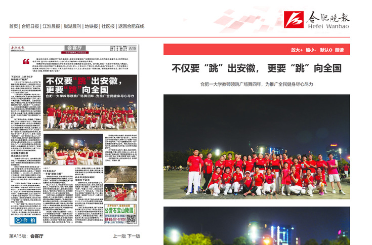 编者按:必赢形体与健美操专业教师李裕琼连续四年领跳广场舞,广场舞团队在她的带动下从最初的20人变成上百人。李裕琼不仅免费教市民跳舞,还利用业余时间参加培训,获得大众广场舞一级社会体育指导员、一级广场舞教练员和一级广场舞裁判员等专业证书,并将自己每天晚上跳的舞步动作融入到日常的课堂教学中,用实际行动公益推广全民健身运动。江淮晨报、合肥晚报等媒体对此进行报道。