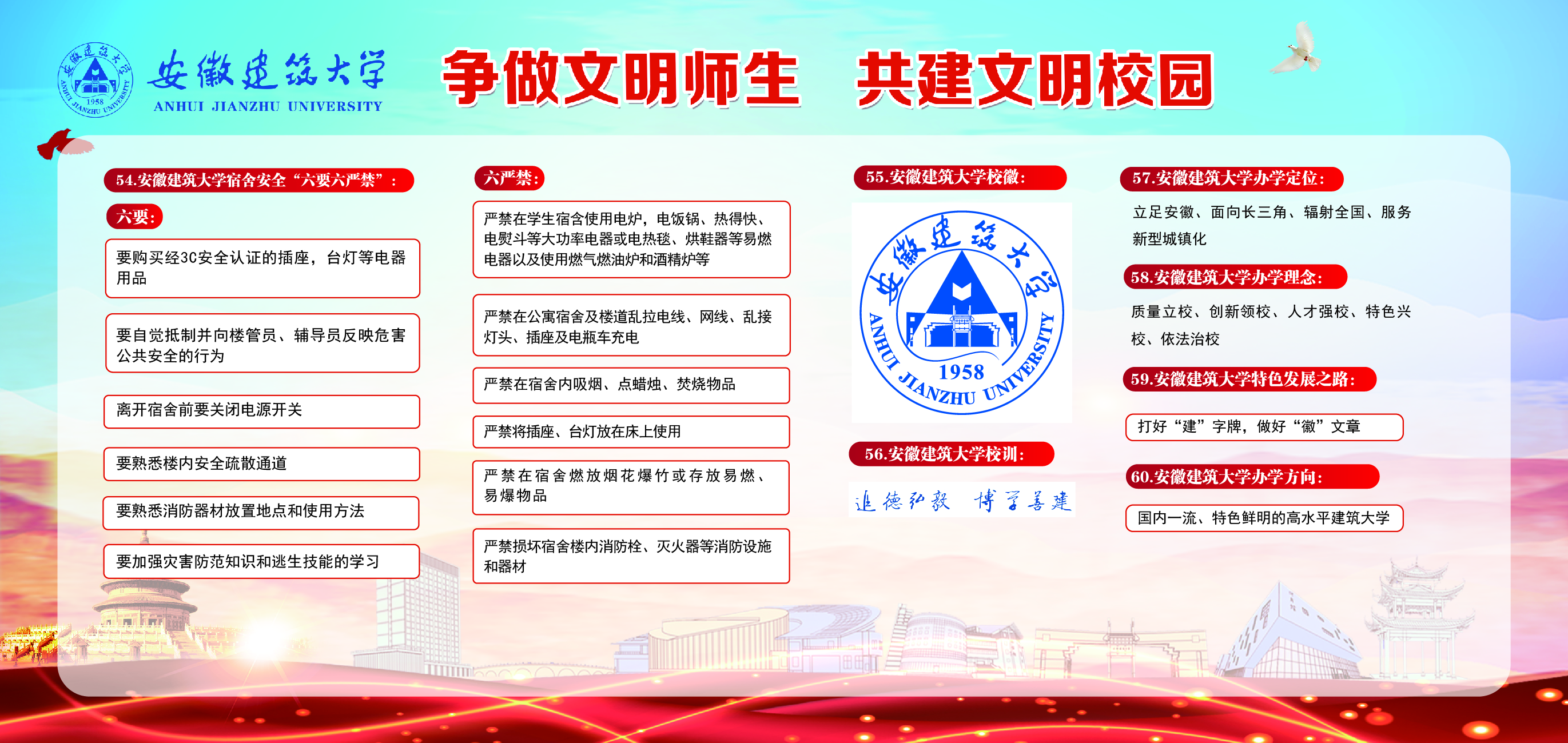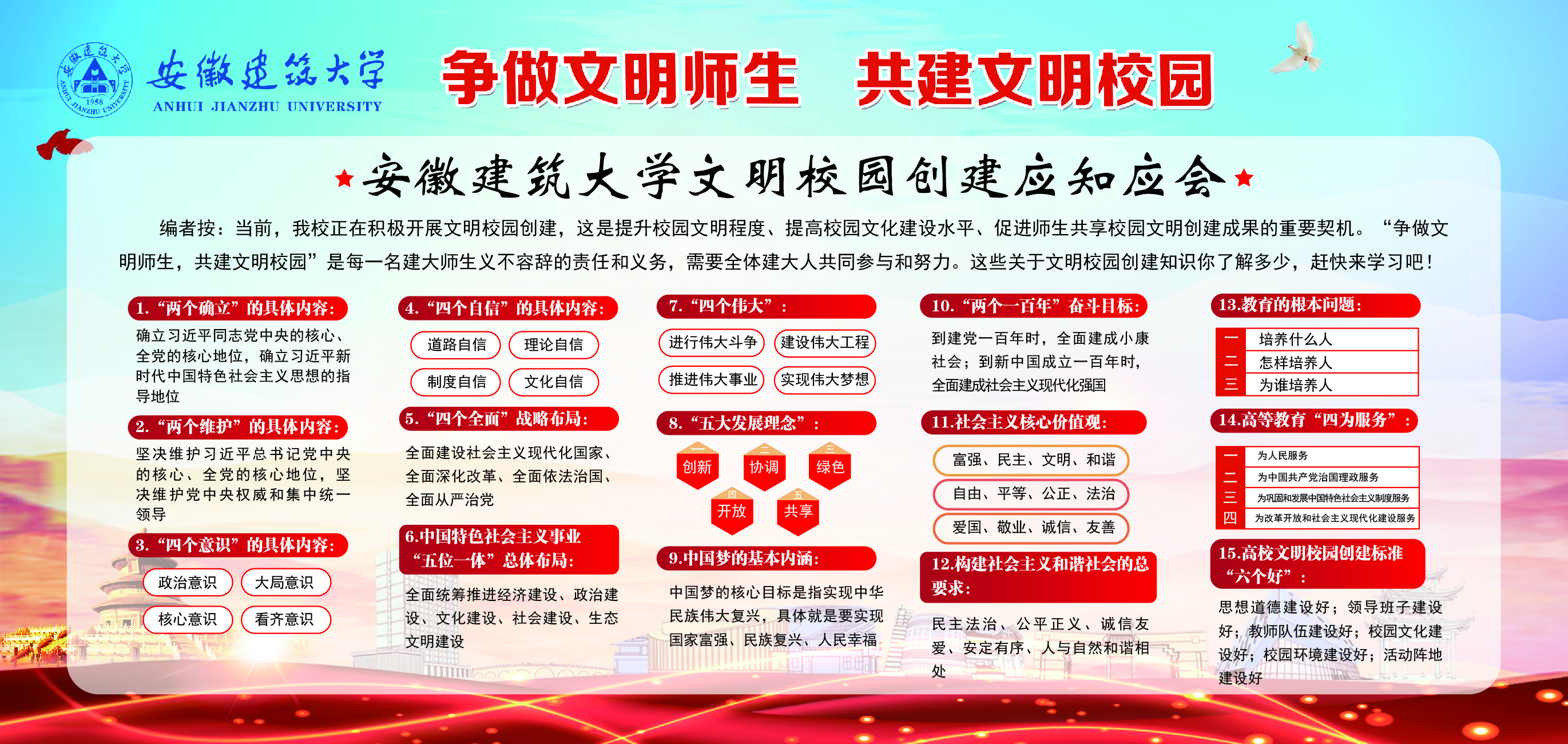 编者按:当前,必赢正在积极开展文明校园创建,这是提升校园文明程度、提高校园文化建设水平、促进师生共享校园文明创建成果的重要契机。“争做文明师生,共建文明校园”是每一名建大师生义不容辞的责任和义务,需要全体建大人共同参与和努力。这些关于文明创建知识你了解多少,赶快来学习吧!