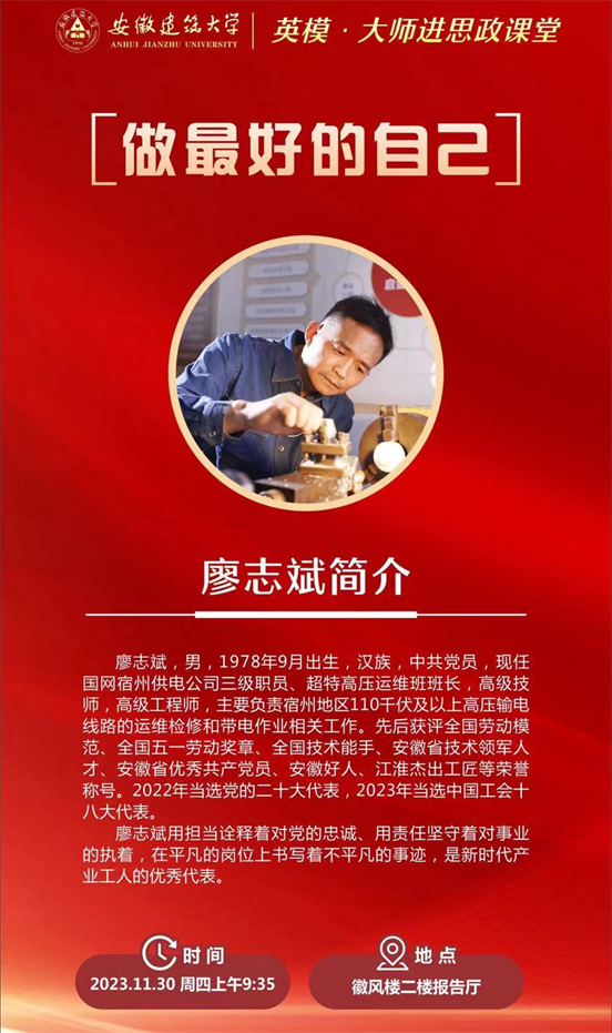 报告会特邀全国劳动模范、全国五一劳动奖章、全国技术能手廖志斌工程师主讲。现将有关事项通知如下: