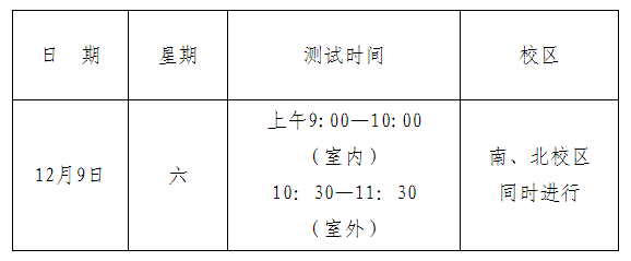 4.相关材料于12月9日测试当天现场交给测试值班老师或交至体育教学部体测中心(南校区体育馆302);