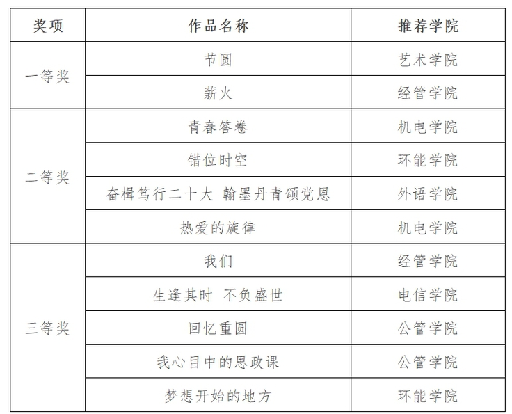 第二届“我心中的思政课”微视频创作展示活动以“强国复兴路,奋斗正青春”为主题,从9月初开始,历时近三个月,在全校范围内收到37份作品。经两轮专家评审,最终评选出一等奖2个,二等奖4个,三等奖个。具体如下: