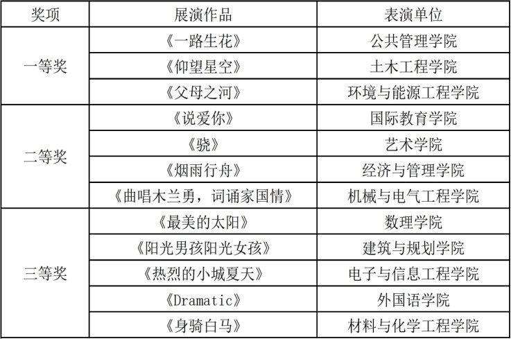 各学院: 为推进大学生美育实践活动发展,学校于2023年11月-2024年1月举办了迎新春美育教育文艺展演活动,本次活动以“挺膺担当砺青春·踔厉奋发向未来”为主题,把以美育人、以美化人、以美培元融入展演活动全过程,涌现出一批优秀的美育成果。本次展演经专家评审,共评选出一等奖3个,二等奖4个,三等奖5个,现予公布: 校团委 2024年1月8日