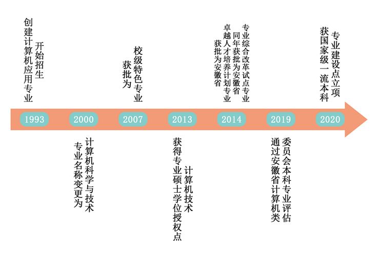 计算机科学与技术专业属于理工类专业,办学历史悠久,1993年招收计算机应用专业,2000年开始招收计算机科学与技术本科专业,2007年获批为校级特色专业;2013年获批计算机技术专业硕士学位授权点,2014年获批为安徽省卓越人才培养计划专业以及安徽省专业综合改革试点专业,2019年通过安徽省计算机类委员会本科专业评估,成绩优异,2020年度获批国家级一流本科专业。