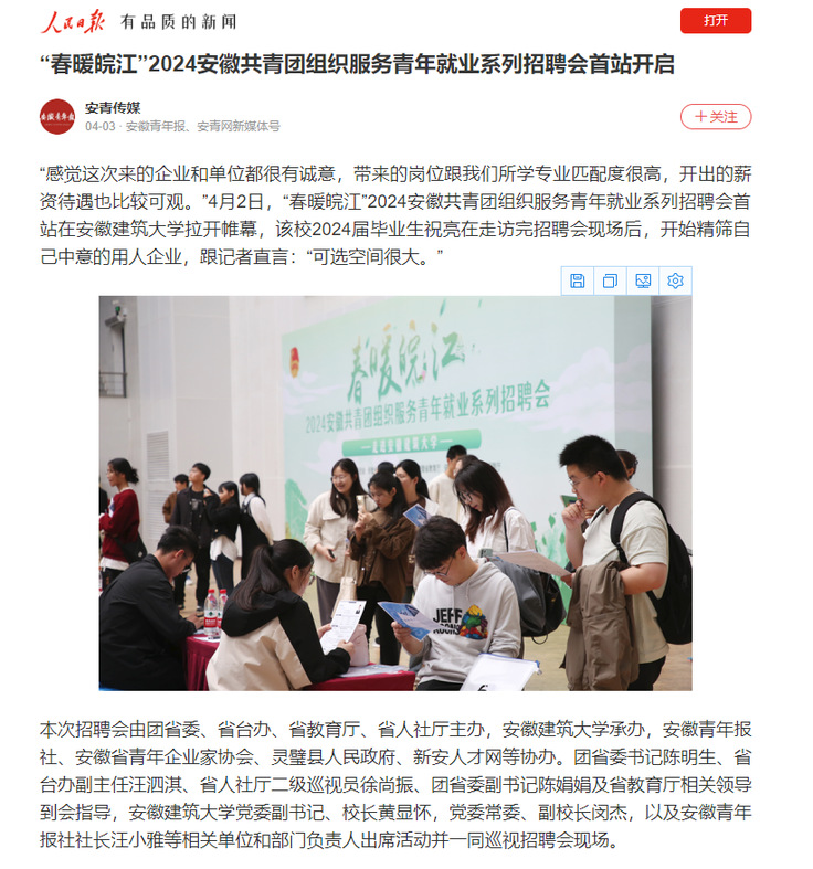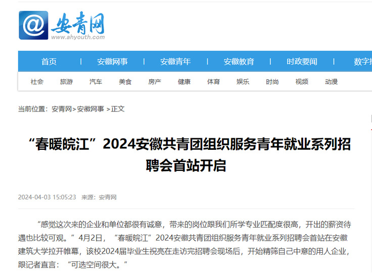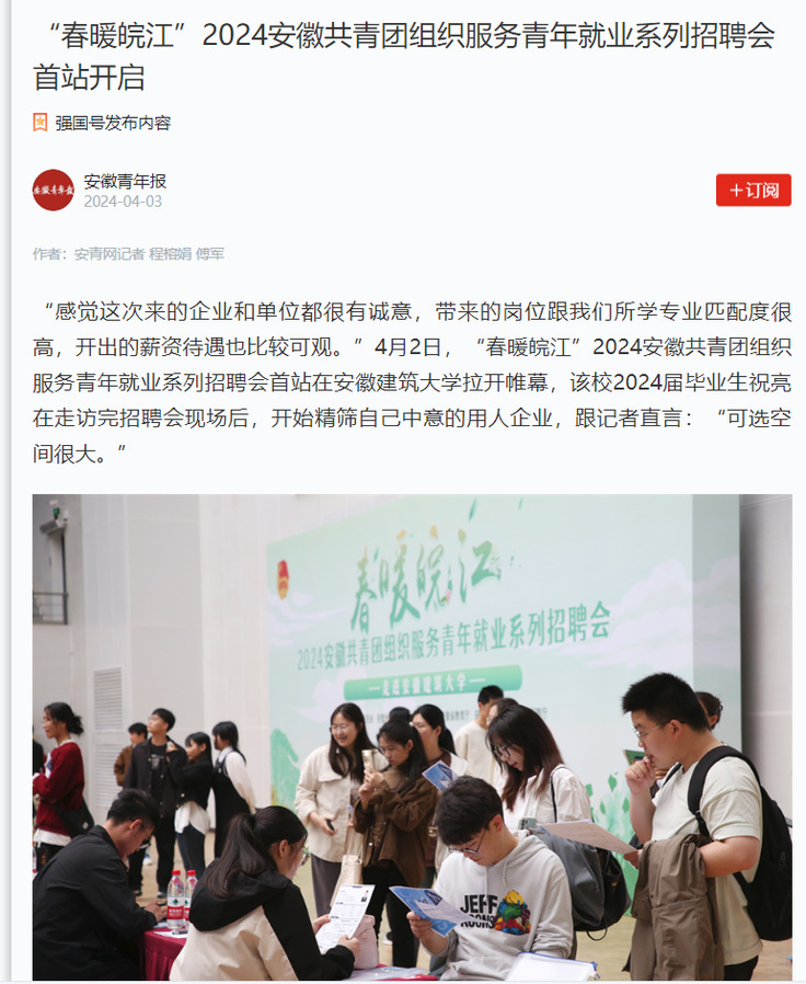 编者按:4月2日,“春暖皖江”2024安徽共青团组织服务青年就业系列招聘会首站在必赢76net线路官网拉开帷幕。本次招聘会遴选了中建五局、中建七局、皖北煤电集团等近150余家优质企业参与,涵盖建筑业、制造业、互联网、电子通信、中文传媒、经济管理等20余个行业,提供对口就业岗位2500余个,2000余名大学生进场应聘。人民日报、学习强国、安青网等媒体对此进行报道。