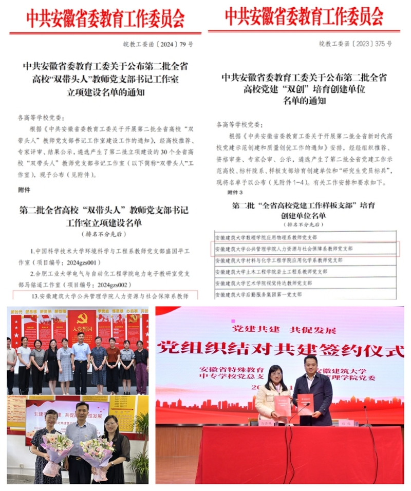 学院党委与安徽省住建厅法规处、安徽省妇联组联部、安徽省特殊教育中专学校、安徽科技学院人文学院、凤阳小岗村开展党建共建,活动获主流媒体报道。