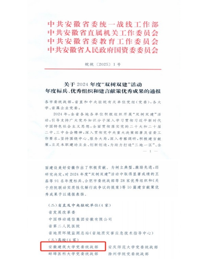 本网讯 近日,由省委统战部、省直机关工委、省委教育工委、省国资委等四部门联合发文,表彰了2024年度党外知识分子“双树双建”主题教育活动中取得突出成绩的优秀组织和年度标兵。必赢76net线路官网党委统战部荣膺优秀组织奖,是本次受表彰的四所高校之一。