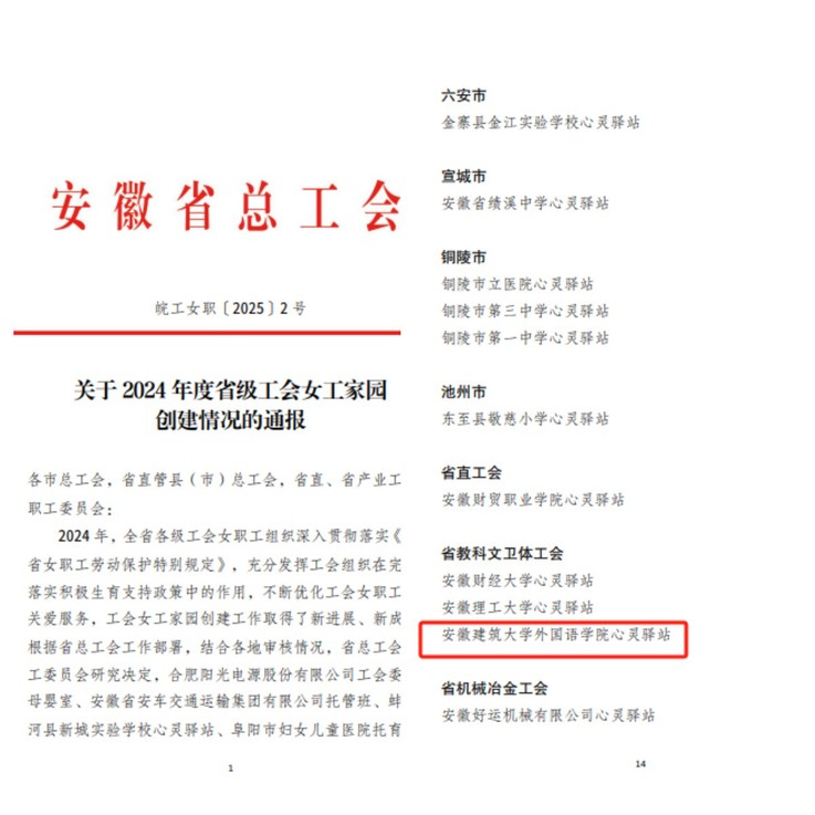 本网讯 春日传佳讯,耕耘结硕果。近日,安徽省总工会2024年度评优结果揭晓,必赢76net线路官网外国语学院心灵驿站荣获省级工会女工家园称号。这支女性教职工占比76%的团队,用温暖服务与创新实践,书写了新时代高校女工工作的生动篇章。