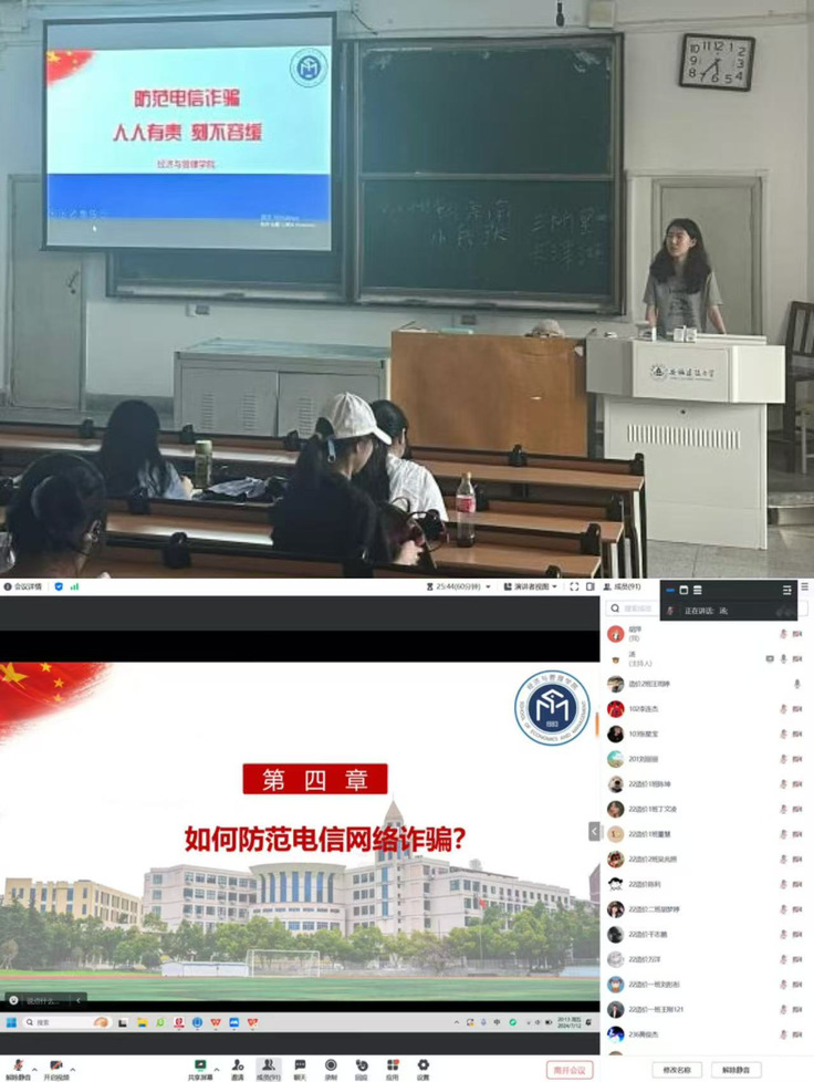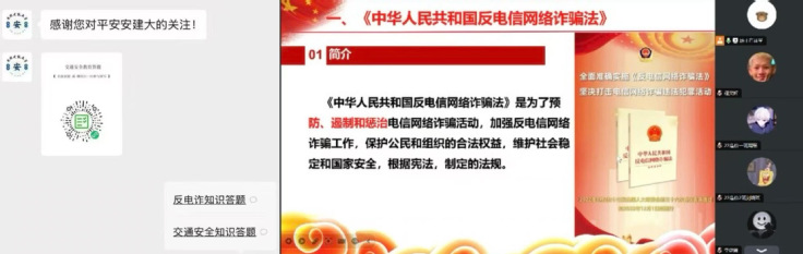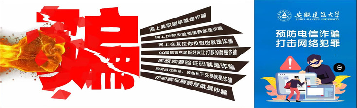 学校精心策划多样化全校师生反电诈集中宣传月教育活动,丰富线上线下宣传手段,增强师生防范意识,提高反电诈辨别能力。一方面,线下邀请民警开展反电诈知识讲座,利用“开学第一课”、主题班会等时机组织学生观看反诈骗警示片和反电诈题材电影《猎屠》,签署防范电信网络诈骗承诺书,发放反电诈宣传册,张贴防诈宣传海报、摆放宣传展板、电子屏滚动显示等形式,让师生深刻认识电信诈骗危害性;另一方面,学校充分利用网络新媒体平台,以《中华人民共和国反电信网络诈骗法》为主线,通过微信公众号“平安安建大”开展反电诈知识答题竞赛活动,组织学生参加安徽省大学生安全知识竞赛,短视频作品征集活动等,定期宣传防范电信诈骗的知识和案例,利用图文、音视频等多种形式,做到人人能警惕、人人会辨别、人人懂宣传,营造全校防范电信诈骗良好氛围。