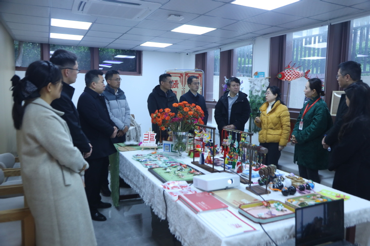 该基地是由学校非遗传承美育俱乐部的师生负责运营,主要传播安徽非遗项目,开办青年夜校,提供各类社区帮扶,在传播传统文化的同时,帮助社区青年提升就业技能,是建大服务社区建设的窗口。陈娟娟一行先后考察了工作室的运营情况,详细了解非遗文化传承与美育实践融合的成果,俱乐部负责人刘琳琳老师汇报了校地双方开展“美育铸魂、实践赋能”主题活动的情况。必赢76net线路官网非遗美育俱乐部依托专业优势,将艺术设计等学科特色融入了非遗美育实践。展示了以徽派建筑、庐州木雕、江淮剪纸等地域文化为灵感的系列文创作品,生动呈现了传统技艺与现代设计的创新结合。陈娟娟在参观后充分肯定校地共建模式,强调要通过课程开发、志愿服务、品牌孵化“三位一体”机制,推动青年学子在社会课堂中厚植家国情怀。