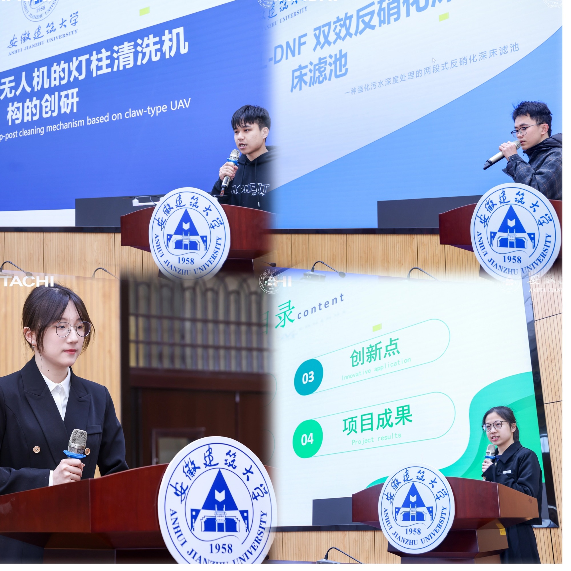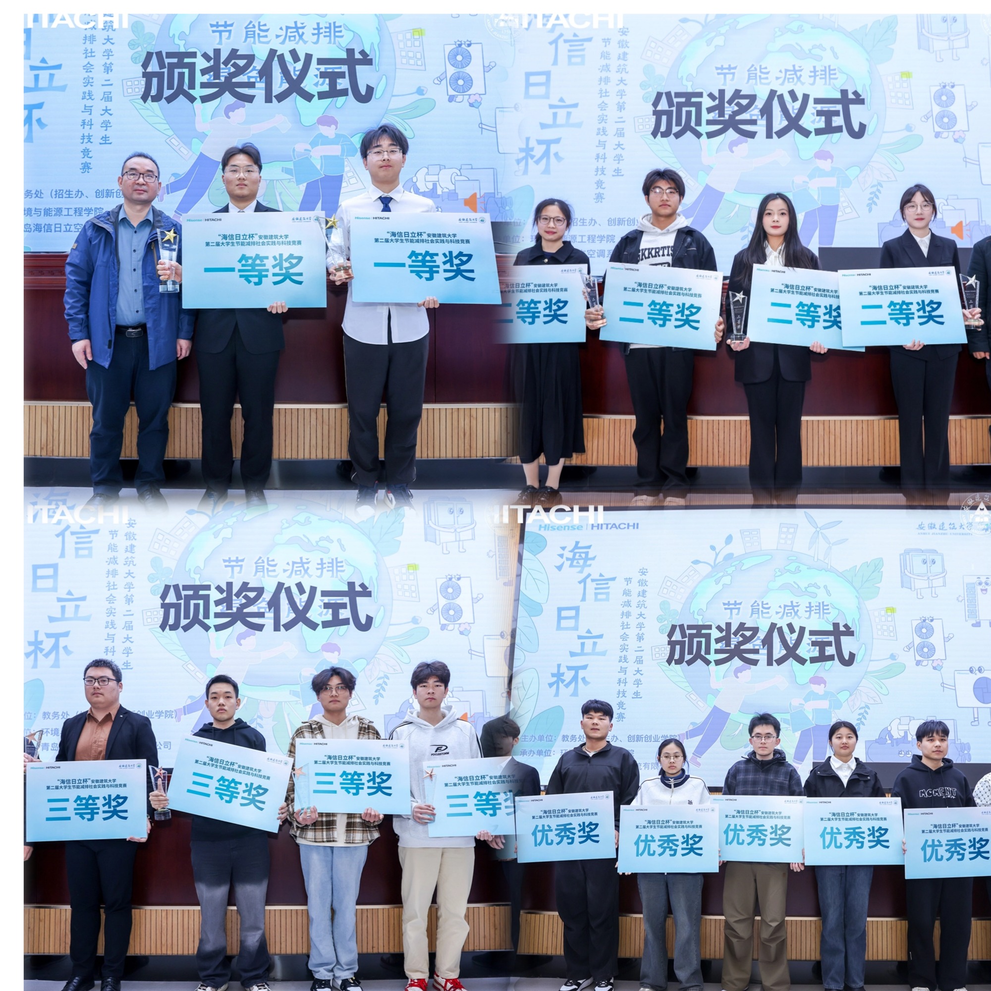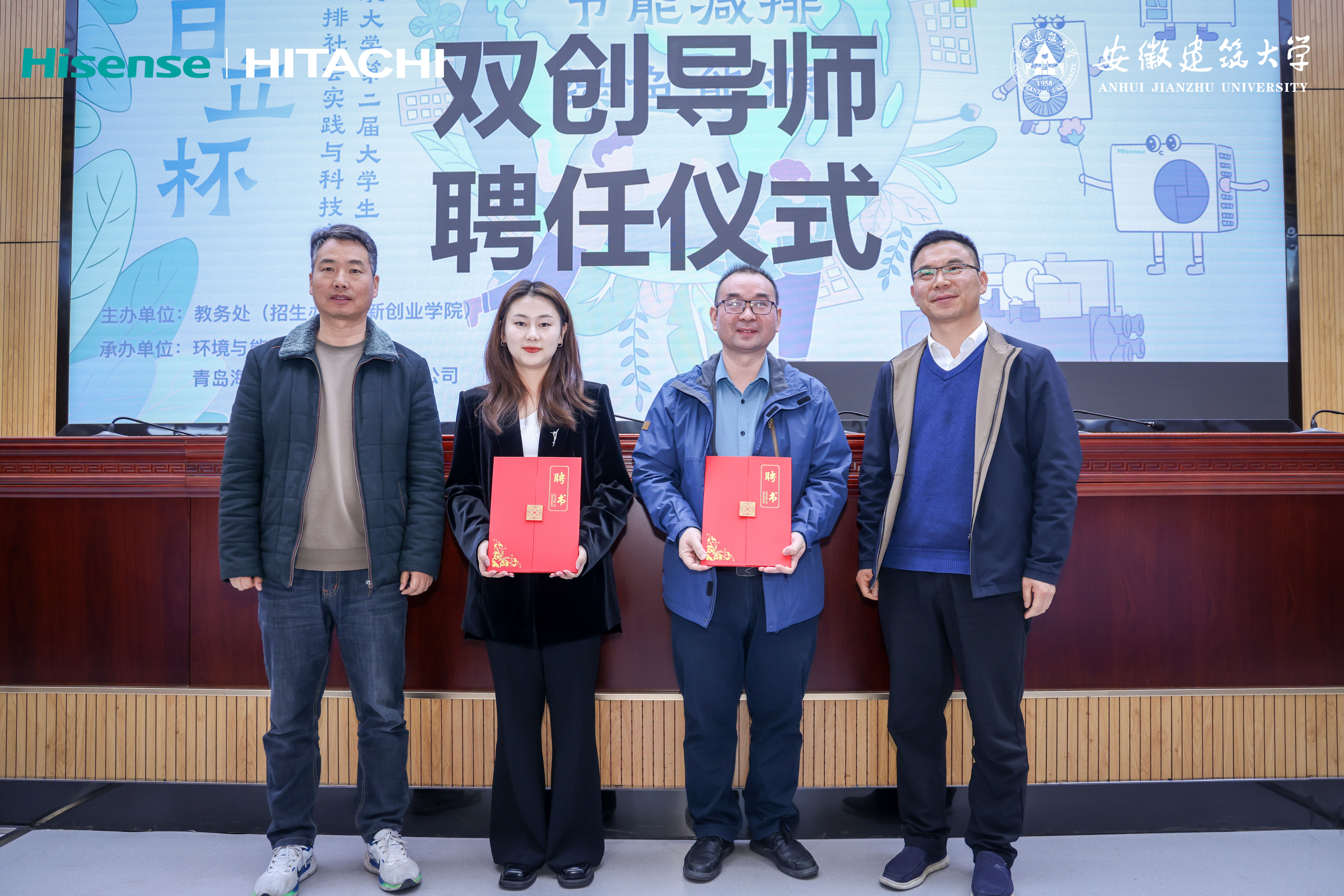 路演完毕后,举办了双创校外导师聘任仪式。聘任仪式上,环能学院党委副书记胡志龙、教务处(招生办、创新创业学院)副处长(副院长)丁超向青岛海信日立空调营销股份有限公司合肥分公司何涛和张瑾颁发了聘书。希望充分发挥校外导师的优势和作用,加强与企业和机构的合作与交流,共同推动创新创业教育的特色化发展。最终,经过激烈角逐,评出一等奖2项、二等奖4项、三等奖4项、优秀奖8项。