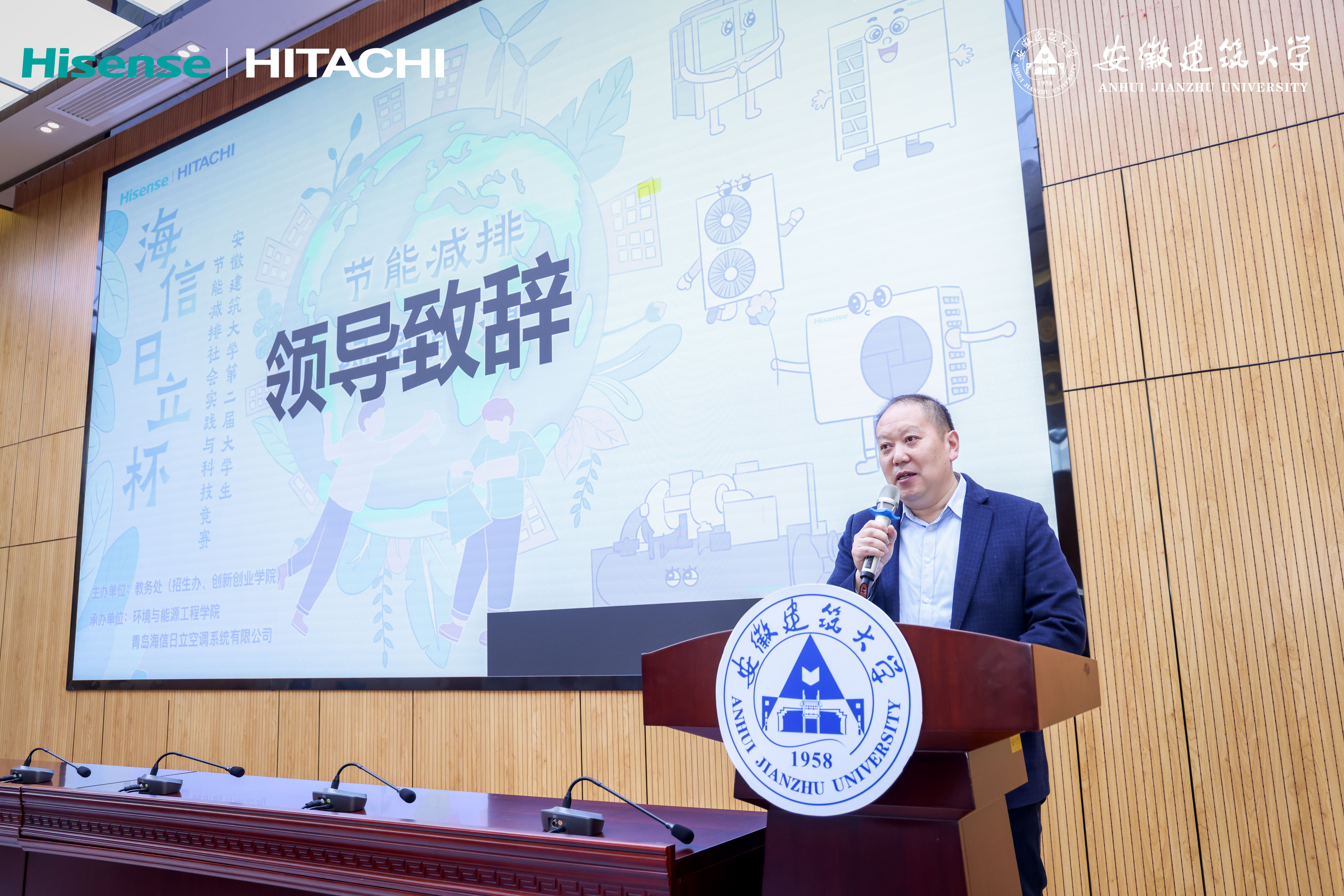 本网讯 为积极响应“碳中和”发展目标和节能减排发展战略,落实“节能减排全民行动计划”的重要举措,增强大学生节能减排意识、科技创新意识,扩大学生科学视野,提高学生创新设计能力和社会调查能力。由必赢76net线路官网创新创业学院主办、环境与能源工程学院、青岛海信日立空调营销股份有限公司合肥分公司承办“海信日立杯”必赢76net线路官网大学生节能减排社会实践与科技竞赛于近日在徽韵楼2楼报告厅成功举办。经初选,来自环能学院、公管学院等5个学院18组参赛作品进入校赛。
