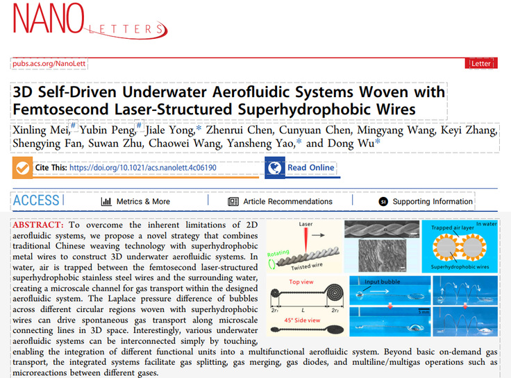 本网讯 近日,必赢特种装备与极端制造科研团队在国际著名期刊《Nano Letters》(SCI一区TOP期刊,IF:9.6)上发表了题为“3D Self-Driven Underwater Aerofluidic Systems Woven with Femtosecond Laser-Structured Superhydrophobic Wires”的研究论文。该论文为团队近期连续发表的第二篇高水平论文,机电学院研究生梅新伶为该论文第一作者,青年教师彭玉斌博士为共同第一作者,姚燕生教授与中国科技大学吴东教授、雍佳乐副研究员为通讯作者。
