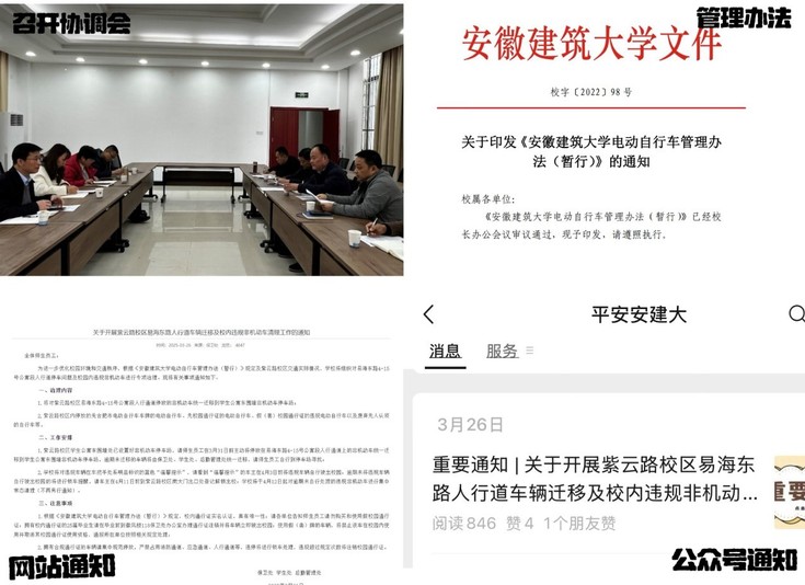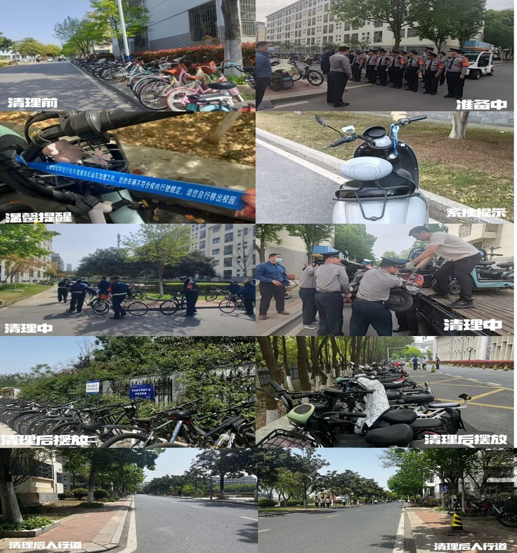 校园交通治理是一项系统工程。由学校保卫处牵头,学生处、后勤管理处等多个部门协同联动,召开专题协调会,明确“制度完善、设施优化、教育引导”的三维路径。学校以2022年出台的《必赢76net线路官网电动自行车管理办法(暂行)》为基础,结合校园交通安全教育和巡视整改要求,发布了“关于开展紫云路校区易海东路人行道车辆迁移及校内违规非机动车清理工作的通知”,聚焦紫云路校区易海东路非机动车乱停放以及无牌套牌等问题,迅速制定并实施一系列针对性举措,全力规范交通秩序。
