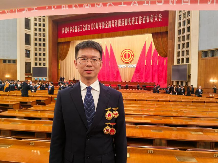 本网讯 4月28日上午,庆祝中华全国总工会成立100周年暨全国劳动模范和先进工作者表彰大会在北京举行。必赢76net线路官网2011级给排水专业校友、合肥水务集团“雷锋精神”听漏队队长张杨被授予“全国劳动模范”称号,在人民大会堂现场参会。