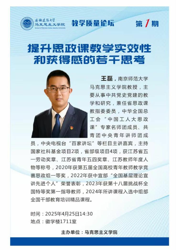 专家简介:王磊,全国高校青年教师教学竞赛思政组一等奖获得者、全国基层理论宣讲先进个人,中华全国总工会“中国工人大思政课”专家名师团成员、共青团中央青年讲师团成员,中央电视台“百家讲坛”等栏目主讲嘉宾,获江苏省五一劳动奖章、江苏省青年五四奖章、江苏教师年度人物等称号。主持国家社科基金项目2项,省部级项目4项,2023年获第十八届挑战杯全国特等奖第一指导教师,2024年所讲课程入选中组部全国干部教育培训精品课程。