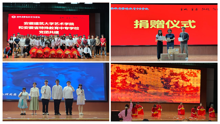 活动以精彩的节目展演开场。盲人学生们用清澈的嗓音演唱《如愿》,每一个音符都饱含着积极向上的生命力量。聋哑学生们表演的舞蹈《木兰行》,让我们看到了他们对生活的热爱和在困难面前的坚毅。艺术学院学生带来的心理情景剧《勇气》,生动演绎了青年成长中的困惑与突破,真实的表演引发了在场学生们情感的共鸣。艺术学院视觉传达专业大一学生共同演唱的《夜空中最亮的星》,唱出了青春追梦的坚定。表演尾声,特殊教育中专学校学生以激昂演讲,分享了直面困难的决心和乐观向上的成长感悟。展演结束后,艺术学院学生党支部书记向特殊教育中专学校赠送了准备的52套绘画工具和书籍,传递艺术学院师生的温暖与关爱。