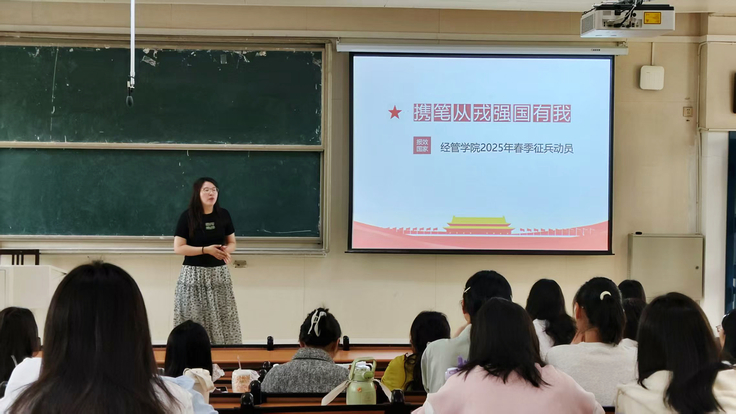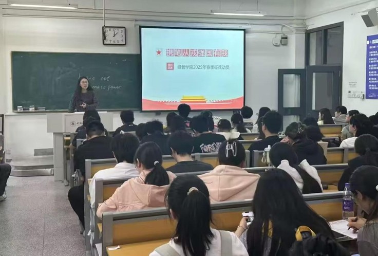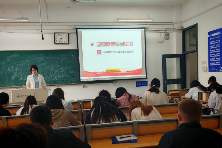 本网讯 为响应国家号召,落实学校2025年征兵工作动员会精神,近期,必赢76net线路官网经济与管理学院组织各专业年级开展“携笔从戎 强国有我”征兵宣传教育系列活动,通过主题班会、退役士兵宣讲、网络宣传等方式,全方位点燃学子参军热情。
