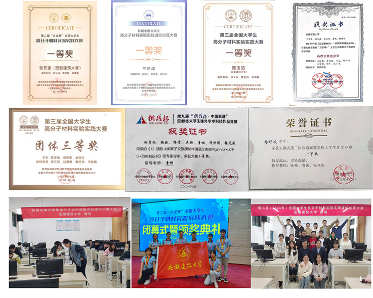 近五年,高分子材料与工程专业学生获得国家级、省级、校级等各类大学生创新训练计划项目80余项。在全国、安徽省各类学科竞赛与创新创业大赛中捷报频传,2021年学生获全国高分子实验大赛一等奖1项、三等奖2项;2023年学生获首届全国高分子虚拟仿真大赛一等奖1项、二等奖7项、三等奖4项;2023年全国大学生高分子实验大赛获一等、二等奖、三等奖各1项,并且获得团体三等奖;2023年获得中国国际大学生创新大赛全国铜奖、安徽省金奖;2024年获得第四届全国大学生高分子材料实验实践大赛一等奖1项、三等奖1项。高分子材料与工程专业始终以“立德树人”为根本,积极推进“以赛育人”工作理念,依托各类大赛,拓宽学生学科视野,强化学生问题意识,增强学生实践动手能力,培育学生家国情怀。