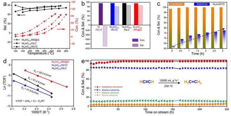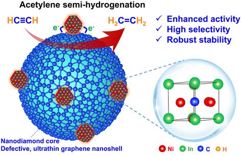 针对传统镍基催化剂选择性低、稳定性差的技术瓶颈,该研究创新性地将反钙钛矿结构Ni3InC0.5与缺陷型纳米金刚石-石墨烯(ND@G)载体相结合,大幅提升了催化剂的整体性能。在实际乙炔半氢化测试中,该催化剂实现了95%的乙炔转化率与85%的乙烯选择性,并可在工业条件下稳定运行超过250小时,超过多数现有催化剂。该研究成果不仅从基础科学层面拓展了反钙钛矿材料在催化领域的应用前景,更重要的是,为开发低成本、高效率的乙烯纯化工艺指明了新的产业化方向。(作者:金震;一审:李刚;二审:王爱国;三审:孙长城)