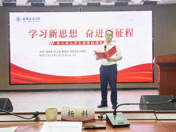 杨科在致辞中指出,举办“学习新思想,奋进新征程”大学生讲思政课比赛,是学校深入贯彻落实习近平总书记对思政课建设作出的重要指示精神,充分发挥思政课立德树人关键课程作用,提高思政课的吸引力与感染力的重要措施。希望同学们能够以青春的视角、真挚的情感、生动的语言去解读思政课的魅力与意义,进一步坚定理想信念,厚植爱国情怀,努力成长为有理想、敢担当、能吃苦、肯奋斗的新时代好青年,在实现中华民族伟大复兴的新征程中书写青春华章!