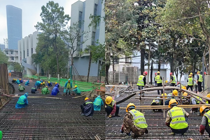 项目开工后,全体参建人员迅速进入紧张工作状态,全力以赴投入到工程建设中。由于金寨路校区建校历史悠久,地下管网错综复杂,基础设施老化严重,而且项目施工作业面狭窄,工期时间短,工程任务量大,相关部门与单位密切配合、协同作战,以科学规划施工方案、优化资源调配为着力点,多点并进高效施工,不分昼夜抢抓工期,成功克服多重挑战,高标准、高质量推进项目建设。