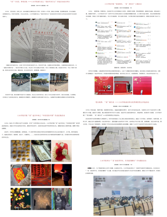 2024年,学院围绕“五育并举”,以重大节点、热点话题为契机,开展专题活动12次、各类学生活动60余次。“易”起寻年味活动中,以“寻年味、话年俗、晒祝福”的方式引导学生传承中华优秀传统文化,“笔尖筑梦”优秀课堂笔记评选,展示涵盖高等数学、材料力学等多学科的精美笔记,营造优良学风;“书影随心,‘易’路同行”红色影评书评活动,收到《红岩》《建国大业》等作品80余篇,激发学生爱国情怀。同时,学院打通微信公众号与易班平台联动,构建新媒体融合矩阵,形成“线上宣传—线下参与—线上展示”的闭环育人模式。