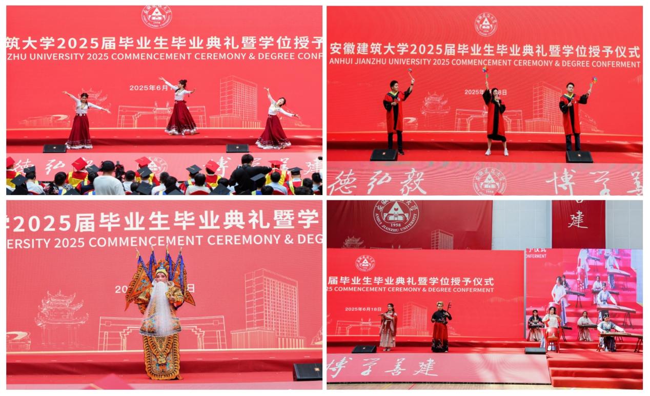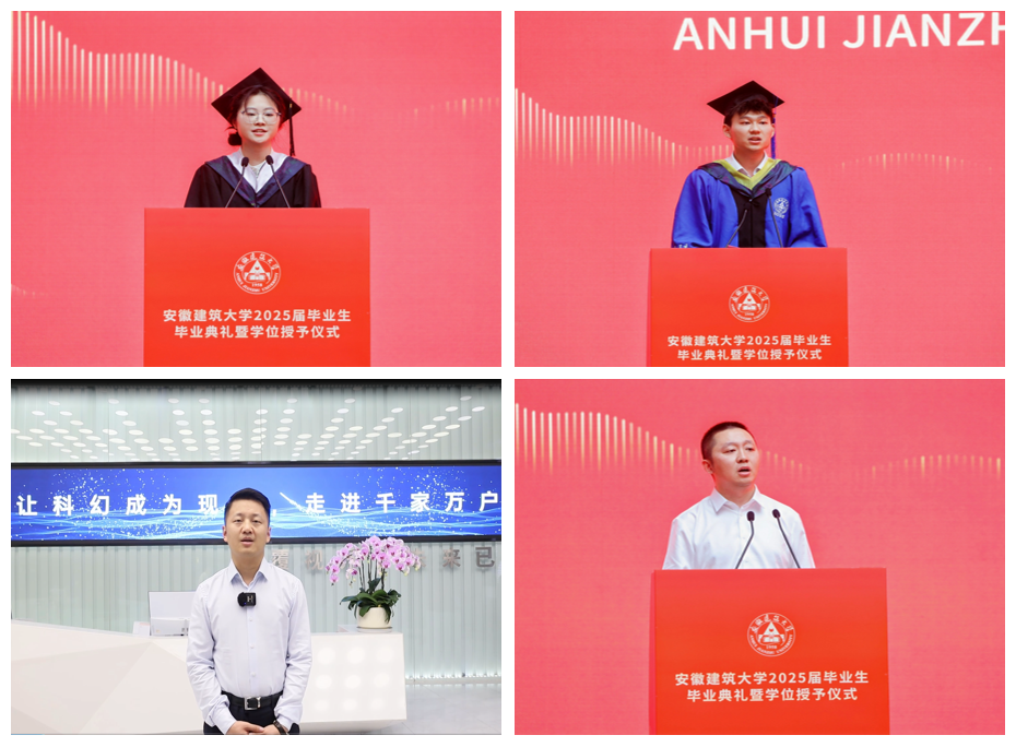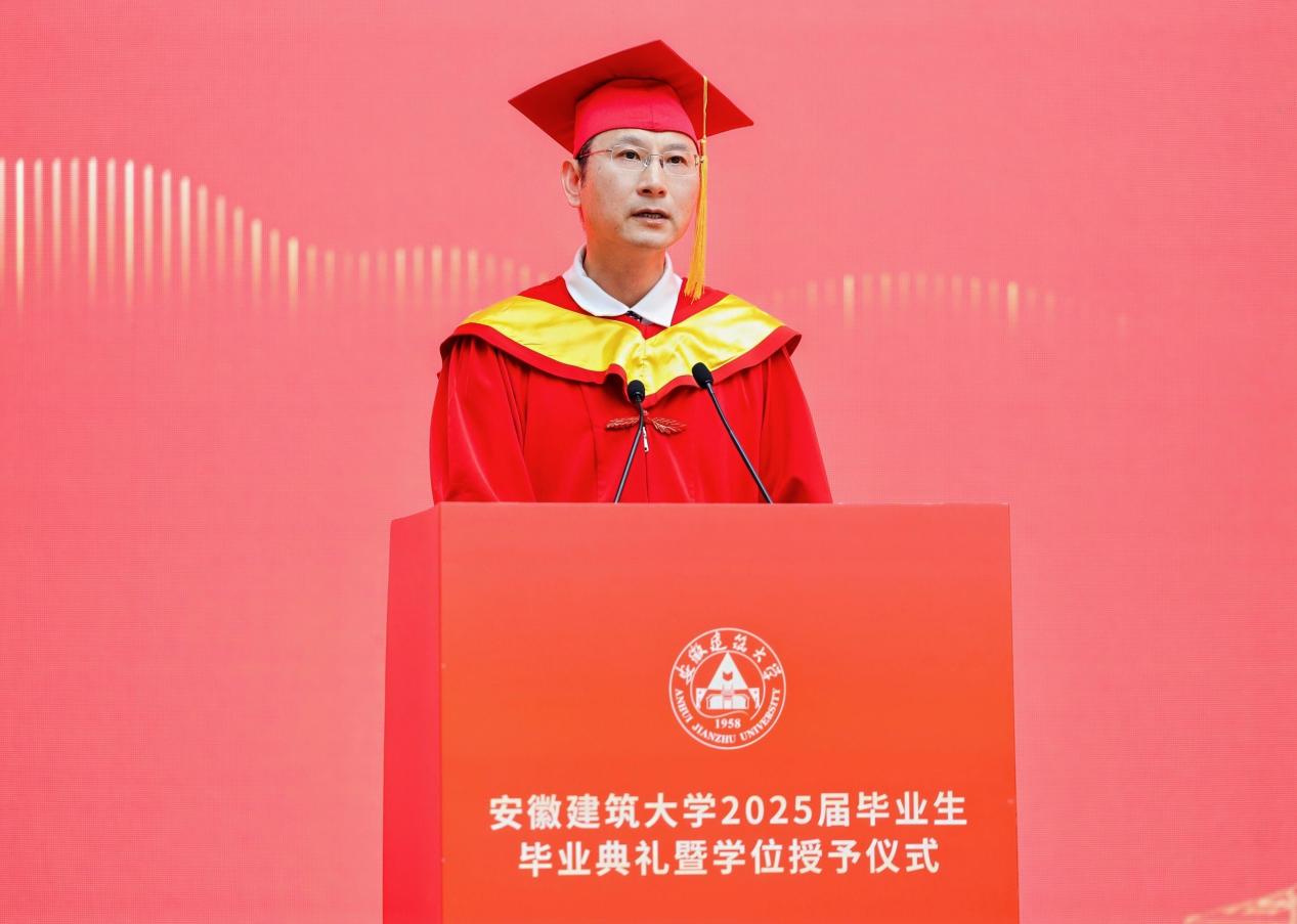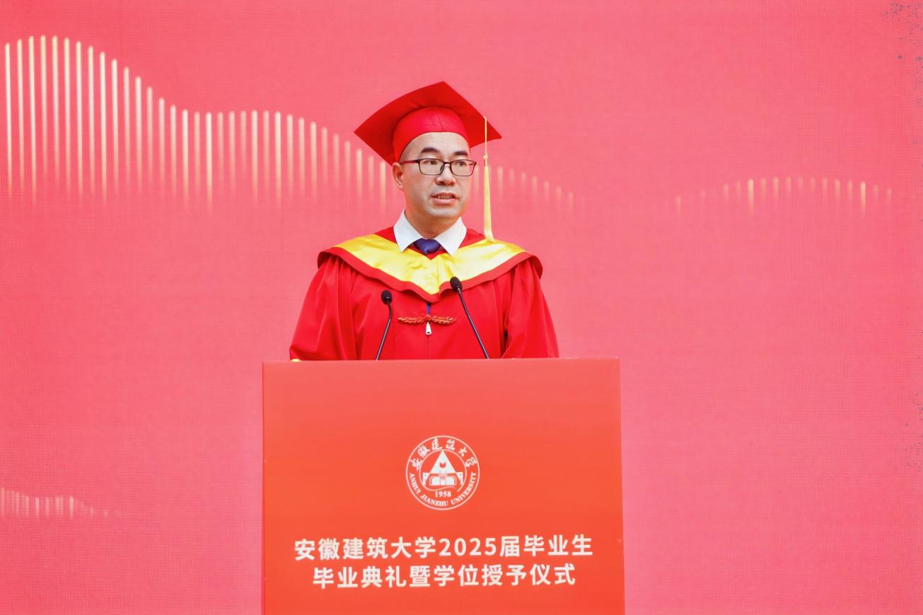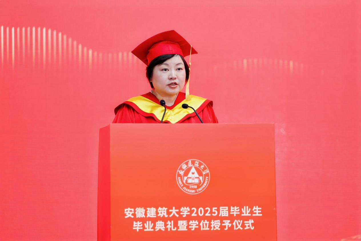 在毕业生代表发言环节,外国语学院2025届本科毕业生李菁菁分享了她从“用语言丈量世界”到立志“用专业讲好中国故事”的成长。数理学院2025届硕士毕业生徐仝友回顾了在建大七年的求索之路,他表示将始终铭记“进德、弘毅、博学、善建”的校训,以科研成果服务国家需求。