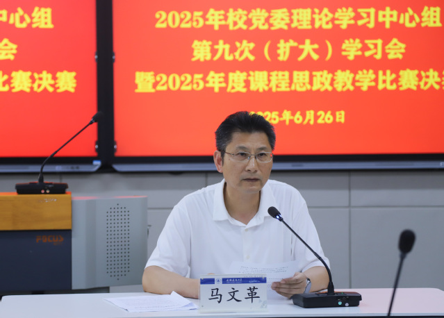 本网讯 为深入贯彻落实党的二十大和二十届二中、三中全会精神,落实立德树人根本任务,推动构建“大思政课”格局,充分发挥课堂教学的主渠道作用,把思想政治教育贯穿人才培养全过程。6月26日,学校党委理论学习中心组在紫云路校区徽学楼教师教学发展培训中心召开2025年第九次(扩大)学习会,全程观摩学习2025年度校课程思政教学比赛决赛。校党委书记马文革主持会议,校党委理论学习中心组全体成员参会并做比赛评委,各学院(部)党政主要负责人、分管教学副院长,相关部门负责人和教师代表参加。