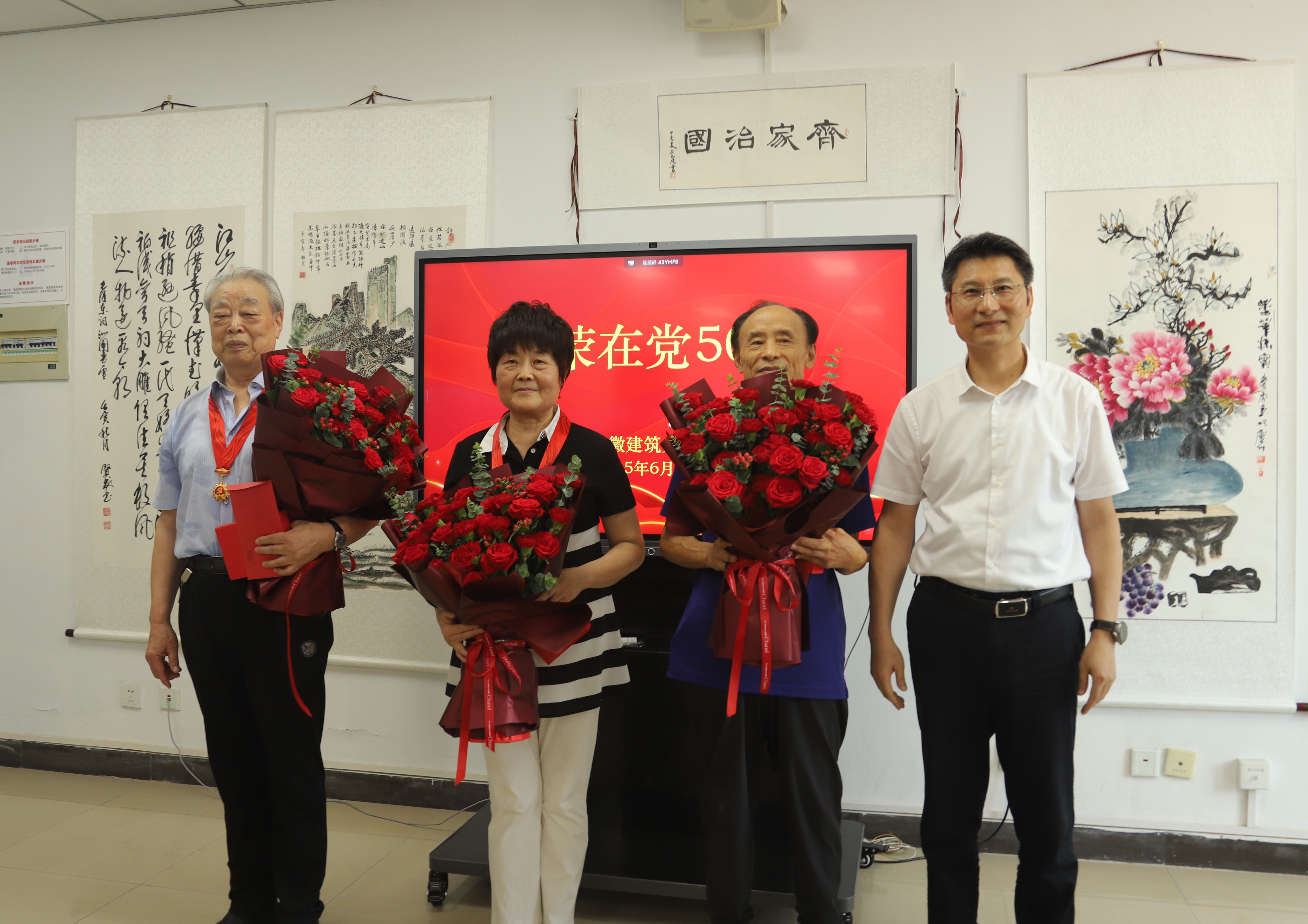 仪式在雄伟庄严的中华人民共和国国歌中拉开序幕。全体与会人员肃立,激昂旋律在会场回荡,熔铸起对伟大祖国的无限忠诚与对党的如磐信仰。汪涛郑重宣读“光荣在党50年”纪念章获得者名单:胡传健、邵群、章祥林。全场响起热烈掌声,向他们为党的事业和学校发展作出的贡献表达崇高的敬意和衷心的感谢。马文革为三位老党员逐一颁发纪念章及慰问金;学生党员代表饱含敬意,向可亲可敬的老前辈献上鲜花。