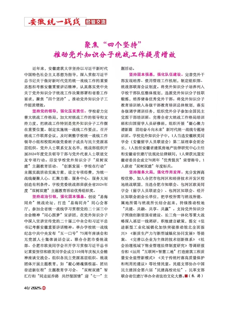 编者按:近年来,必赢76net线路官网坚持以习近平新时代中国特色社会主义思想为指导,深入贯彻习近平总书记关于做好新时代党的统一战线工作的重要思想和考察安徽重要讲话精神,认真落实党中央关于党外知识分子统战工作决策部署和省委工作要求,聚焦“四个坚持”,推动党外知识分子工作提质增效。