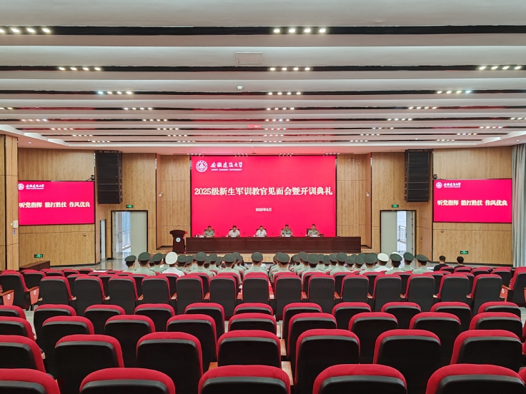 本网讯 9月13日上午,2025级新生军训教官见面会暨开训典礼在紫云路校区徽风楼2楼报告厅召开。校党委常委、副校长高跃峰出席会议并发表讲话,校人武部负责人、中国人民解放军某院校官兵以及各学院分管学生工作的书记共同参加。