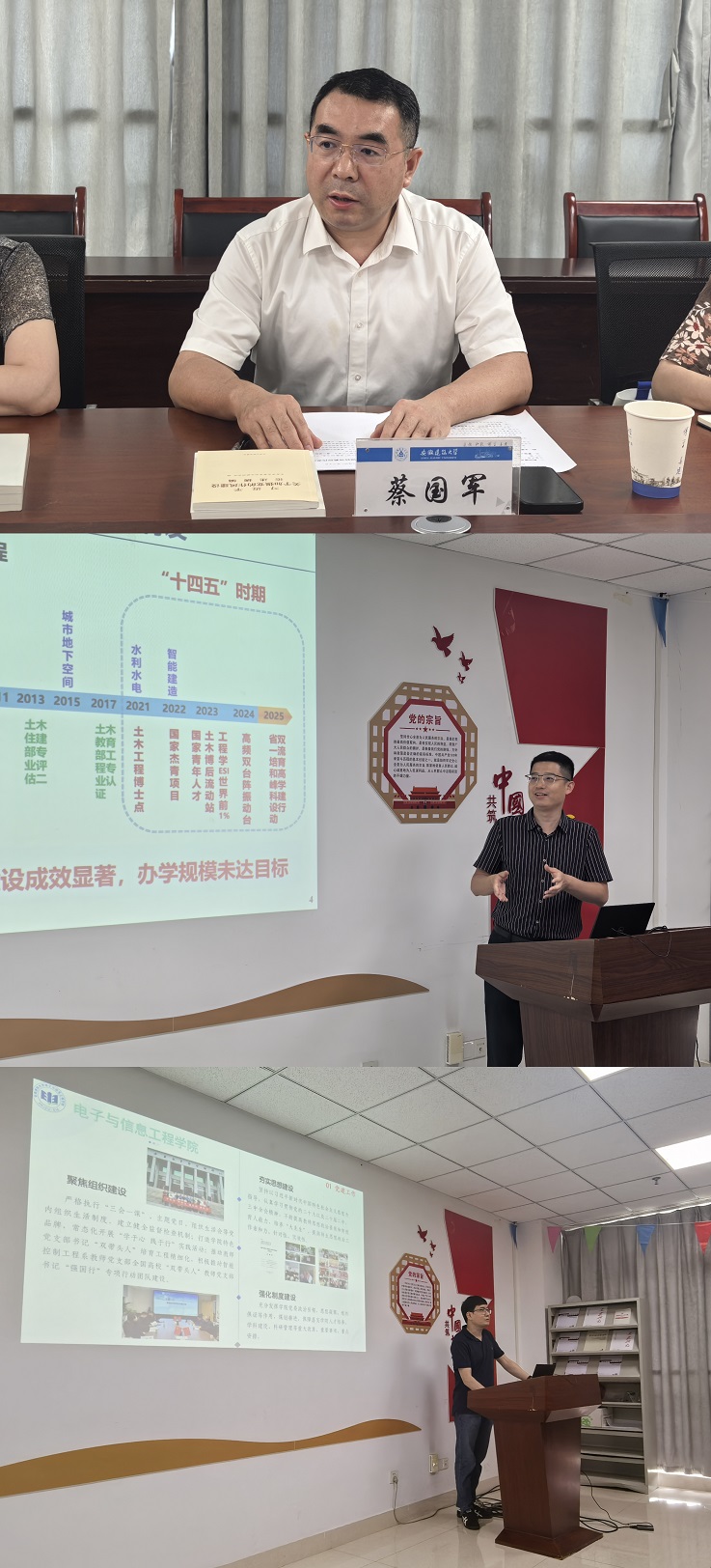 本网讯 9月17日,电子与信息工程学院与土木工程学院以联合学习形式,在紫云路校区徽风楼1112会议室召开党委理论学习中心组集中学习会议。会议由电信学院党委书记张润梅主持,两院党委理论学习中心组成员全员参会,学校党委副书记、校长蔡国军出席会议并作点评指导。