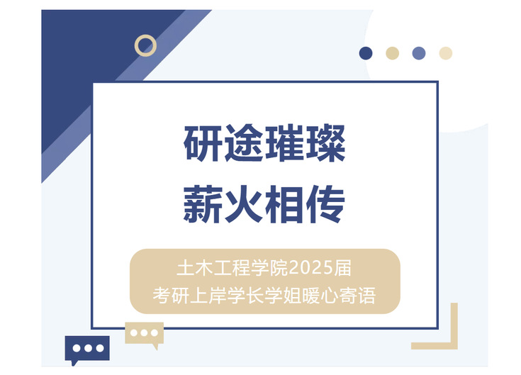 在毕业季与考研备考季交织的六月,土木学院“研途璀璨,薪火相传”考研经验交流会温情开讲。多位成功上岸的2025届毕业生学长,以亲身经历为学弟学妹拆解考研难题,用真挚寄语传递逐梦力量,为土木学子的考研征途点亮微光。