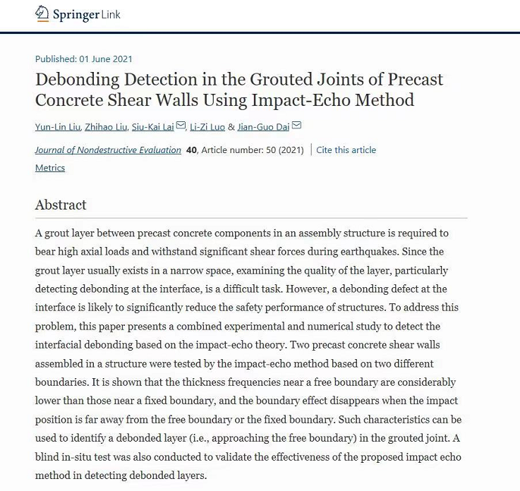 在装配式结构中,预制混凝土竖向构件之间的灌浆层需要承受高轴向压力,并在地震中承受较大的剪力。界面处的脱层缺陷可能会显著降低结构的安全性能,由于灌浆层通常存在于狭窄的空间中,检查灌浆层的质量,尤其是检测界面处的脱层是一项比较困难的任务。针对这一问题,团队提出了一种基于冲击回波理论的界面脱层检测方法(发明专利:ZL201711074920.8)并通过数值模拟和试验及现场盲测验证了该方法的可靠性。