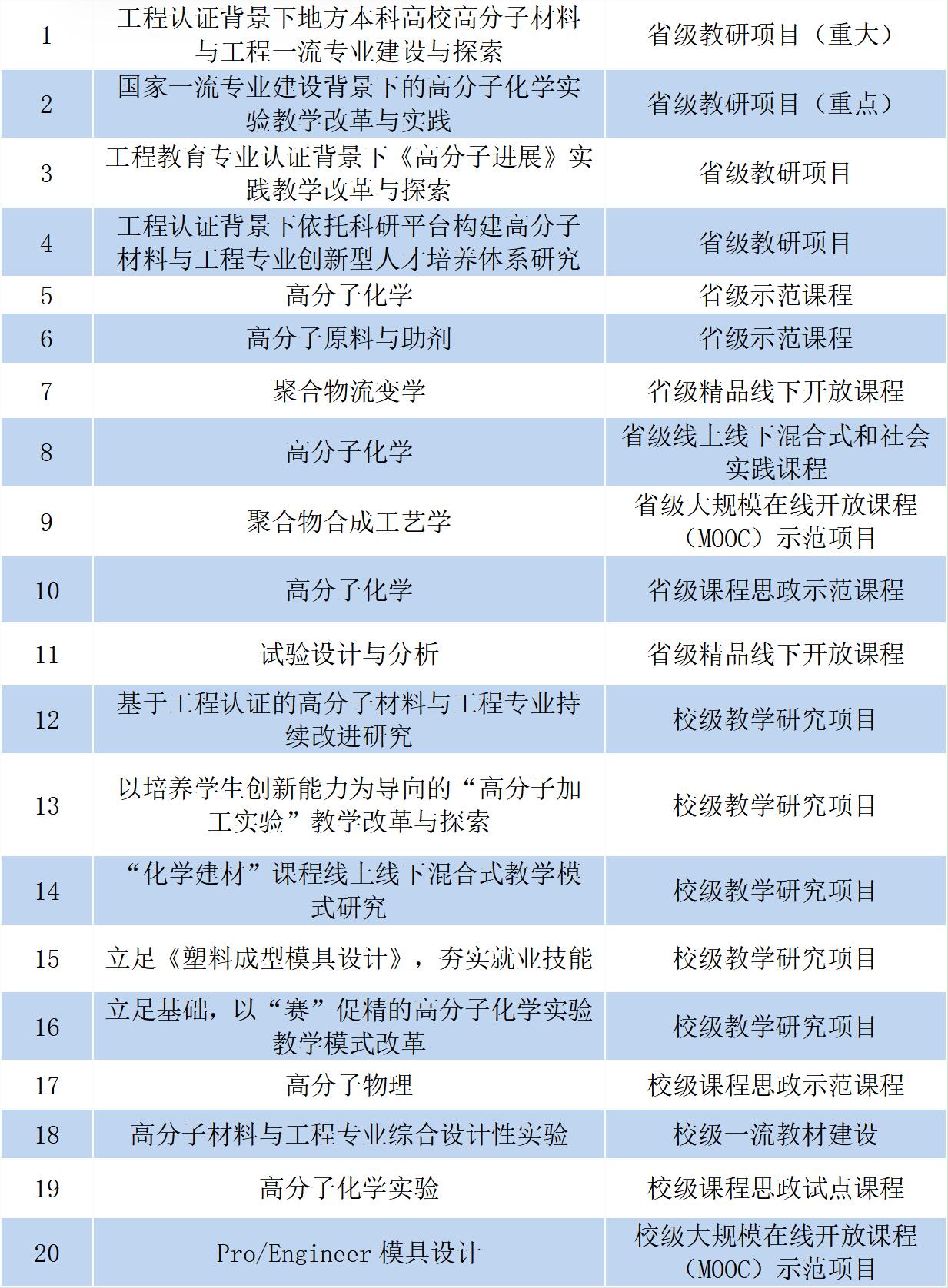 本专业现有专业教师 18名,其中教授9人、副教授6人,分别占教师总人数的50%、33.3%;具有博士学位教师15人。“高分子材料与工程专业课程教学团队”2016年被评为省级教学团队、“高分子材料与工程系”2021年被确立为省级示范基层教学组织,同时获必赢76net线路官网“本科教学先进集体”称号。