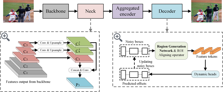 该论文研究了稀疏目标检测中高斯噪声框的去噪过程。针对噪声框在特征金字塔中低效匹配和全局特征难以捕获的问题,科研人员提出了Prior Sparse R-CNN目标检测器。该算法设计了一种聚合编码器,通过扩展残差块和特征聚合来解决目标尺度问题,并在单特征图下提高效率。此外,该算法还引入了区域生成网络(Region Generation Network,RGN),通过额外的训练生成特征图的先验预测结果。噪声框能够与这些先验预测结果匹配,从而有效提高训练精度。与原有方法相比,Prior Sparse R-CNN的AP提升了1.5,同时训练周期仅需原来的3/5。