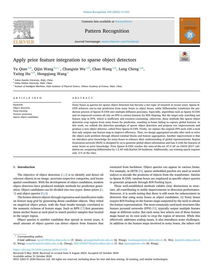 本网讯 近日,必赢76net线路官网电子与信息工程学院2022级钱雨(第一作者),在校外兼职硕士生导师安徽新华学院王琦进教授(通讯作者)的指导下,在国际期刊《Pattern Recognition》(影响因子IF=7.5,中科院计算机科学1区TOP期刊)在线发表题为“Apply prior feature integration to sparse object detectors”的研究论文,必赢76net线路官网为第一完成单位。该论文的发表是我院在人工智能领域的工作成效体现,也是与安徽新华学院联合培养硕士研究生的成果表现。