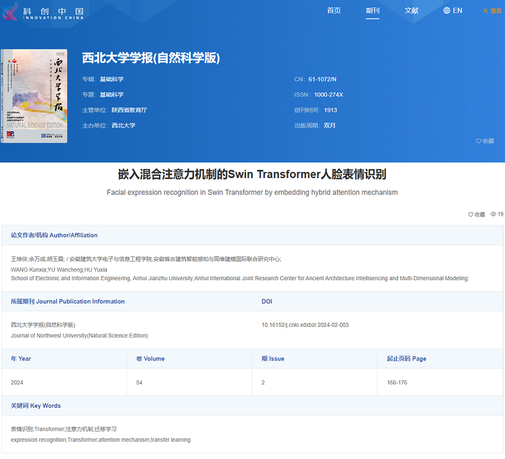 本网讯 近日,中国科学技术协会公布了科技期刊双语传播工程的遴选结果,电信学院王坤侠副教授(第一作者)、余万成(研究生)等人发表在《西北大学学报(自然科学版)》的科学研究论文《嵌入混合注意力机制的Swin Transformer人脸表情识别》成功入选2024年度中国科协“结构化论文双语传播工程”,文献通过“科创中国”网站上线发布(https://castsycb.cbpt.cnki.net)。