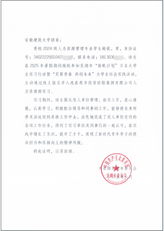 本网讯   近日,校团委收到共青团芜湖市委员会发来的表扬信,对公管学院 2024 级人力资源管理专业学生姚锐在“扬帆计划”实习实践活动中的出色表现给予高度认可与赞扬。