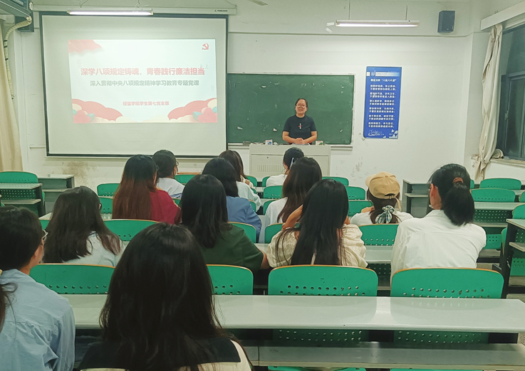 为进一步强化毕业生党员的党性修养和使命担当,做好毕业生党员离校教育,引导广大毕业生党员把初心落在行动上、把使命担在肩膀上,近日,学生第七党支部书记金三人以“深学八项规定铸魂,青春践行廉洁担当”为题为全体毕业班党员讲授专题党课。
